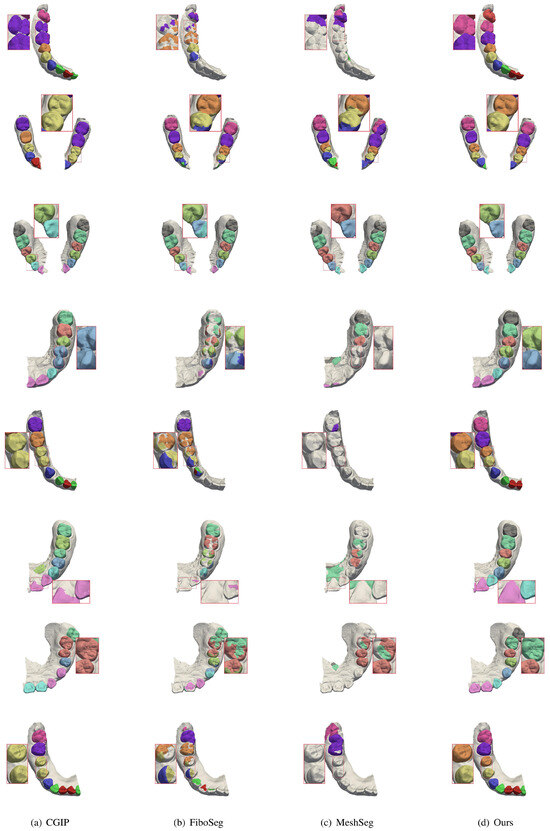 In addition, to verify the stability and accuracy of our method under non-ideal conditions, we test it on patients with missing teeth, misaligned teeth, and diagnostic cases of incomplete jaws, comparing the results with those of the method proposed by the CGIP team [25], the FiboSeg team [25], and MeshSeg [11]. As shown in Figure 6, for the case of tooth misalignment, all the methods except ours have different degrees of under-segmentation and mis-segmentation, which leads to the confusion of the number of the final segmented teeth. However, the present method is almost unaffected. As shown in Figure 7, in cases of missing teeth, most methods have over-segmentation, which is caused by interference from the gingiva at the location of the missing tooth. This leads to errors such as recognizing the same tooth as two teeth, or misidentifying the gingiva in the missing tooth area as an actual tooth. Through the above tests, the following conclusion can be drawn: fully automated methods are highly dependent on the training dataset, resulting in limited generalization ability. Our method effectively avoids these errors in cases of missing and misaligned teeth, achieving more accurate and stable tooth segmentation.
