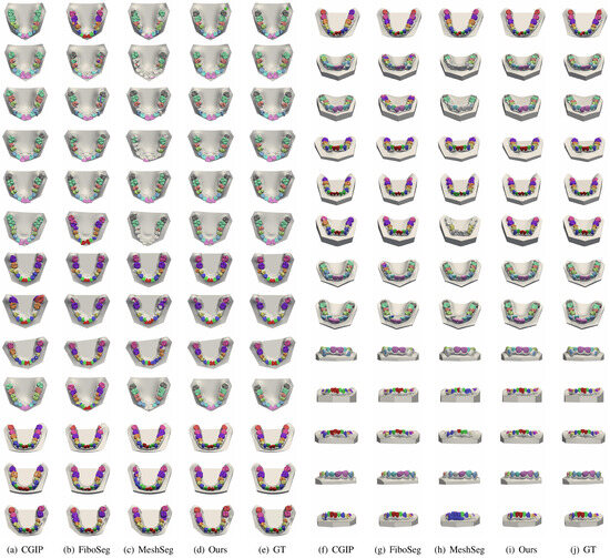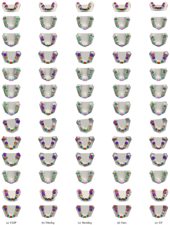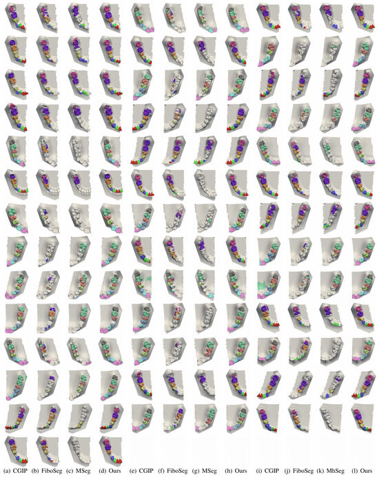 We first test the performance of the proposed method under ideal conditions (no missing teeth, misaligned teeth, and incomplete jaws) by using the test set provided by the MICCAI 3DTeethSeg22 and comparing it with the top six methods in the MICCAI competition (CGIP, FiboSeg, IGIP, TeethSeg, OS, Chompers), and the experimental results are shown in Table 4. As shown in Table 4, the method proposed in this paper achieves the best segmentation results, comparable to other methods. In Table 4, CGIP, IGIP, TeethSeg, and Chompers are all 3D segmentation methods, FiboSeg and this paper’s method are based on 3D-to-2D projection segmentation, and the OS method is a 3D segmentation method that uses 2D dental images to locate the center of the teeth. The 3D tooth segmentation methods are often affected by point sampling. Due to the design of the 3D scanner, the dental mesh exhibits a high sampling density near the boundary, resulting in points that may correspond to multiple labels. This overlap complicates the extraction of precise tooth instance labels. To resolve this, CGIP applies a boundary-aware point sampling method to increase the density of sampled points at the boundary regions. By combining results from both farthest point sampling and boundary-aware point sampling, CGIP effectively achieves accurate tooth instance segmentation. The 2D-based FiboSeg method sometimes results in small holes within the segmented regions, which may be related to the prediction accuracy of U-Net, as the training dataset images have a relatively low resolution of . FiboSeg performs some preprocessing to achieve better results. FiboSeg employs an ‘island removal’ approach at the end of the prediction and a morphological closing operation to smooth the boundary of the segmented teeth.