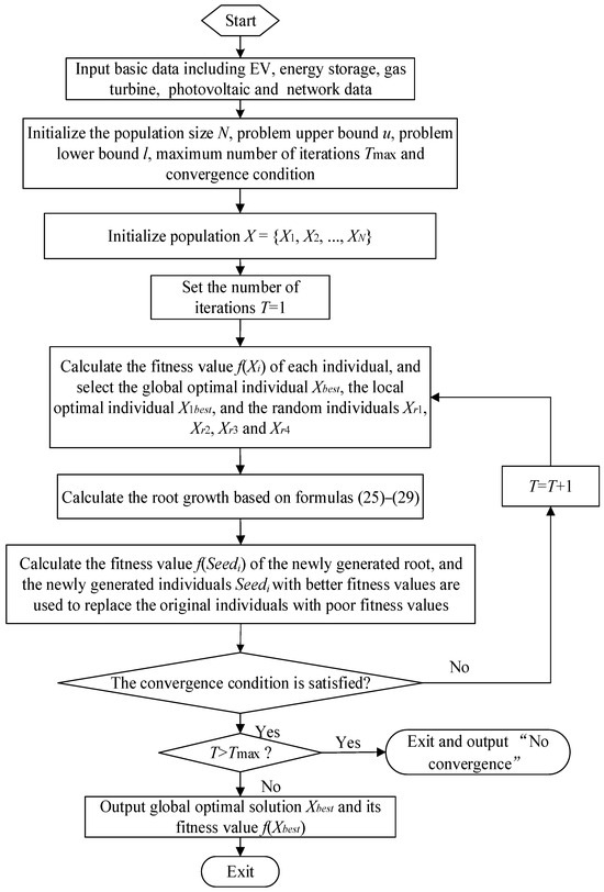 In recent years, the simulated plant root growth optimization algorithm, as a novel intelligent optimization algorithm, has been widely applied in the field of complex system optimization due to its powerful global search capability and robustness [27,28,29,30]. This algorithm effectively explores the solution space by simulating the growth process of plant roots seeking nutrients and water in the soil, making it particularly suitable for solving nonlinear, multi-modal optimization problems. The simulated plant root growth optimization algorithm demonstrates promising application prospects in the economic optimal dispatch of virtual power plants/microgrids that include electric vehicles/energy storage. Reference [31] was the first to apply this algorithm to the economic dispatch problem in power systems, and their research demonstrated that the algorithm exhibits good performance in solving complex economic dispatch problems. Reference [32], on the other hand, applied the algorithm to the optimal dispatch problem of microgrids with renewable energy sources, further enhancing the algorithm’s performance by introducing an adaptive mechanism.