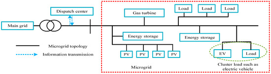 In order to verify the effectiveness of the method proposed in this paper, a simulation experiment was carried out on an actual microgrid in Western China based on the simulation platform of MATLAB R2014a. For the plant root-inspired growth optimization algorithm, the initial step size of the algorithm was set to 0.5 units, the main root branching probability was set to 0.2, the lateral root branching angle was set to 75 degrees, the resource sensitivity was set to 0.8 (strong moisture guidance) and the stopping condition of the algorithm was set to depth > 3 units. The actual configuration of the microgrid is shown in Figure 2. Relevant simulation parameters can be found in Reference [30]. Additionally, the theoretical model of electric vehicle cluster is established in the second part of the paper, and then, the charging and discharging of the electric vehicle cluster is simulated based on the MATLAB simulation platform for numerical simulation.