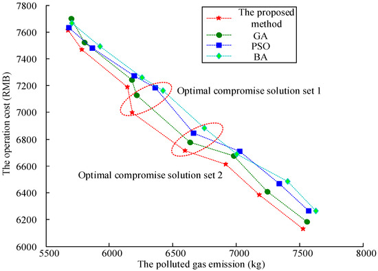 As can be seen from Table 2, for the GA method, in the optimal compromise solution set 1, the polluted gas emission and operating cost are 6215 kg and 7127 RMB, respectively; in the optimal compromise solution set 2, the polluted gas emission and operating cost are 6635 kg and 6779 RMB, respectively; for the PSO method, in the optimal compromise solution set 1, the polluted gas emission and operating cost are 6362 kg and 7184 RMB, respectively; in the optimal compromise solution set 2, the polluted gas emission and operating cost are 6663 kg and 6843 RMB, respectively; for the BA method, in the optimal compromise solution set 1, the polluted gas emission and operating cost are 6426 kg and 7161 RMB, respectively; in the optimal compromise solution set 2, the polluted gas emission and operating cost are 6748 kg and 6883 RMB, respectively; for the method proposed in this paper, in the optimal compromise solution set 1, the polluted gas emission and operating cost are 6183 kg and 6998 RMB, respectively; in the optimal compromise solution set 2, the polluted gas emission and operating cost are 6597 kg and 6713 RMB, respectively. By comparing the values in each column of Table 2, it can be found that the polluted gas emission and operation cost of the method proposed in this paper are the minimum, which further proves the effectiveness of the method proposed in this paper.