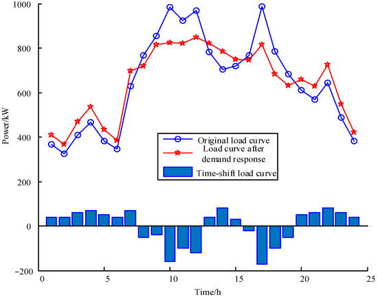 In order to further analyze the effect of electric vehicle cluster regulation in the demand response, and to reduce costs and increase efficiency for virtual power plants, this paper analyzes the influence through the change in load before and after the demand response, as shown in Figure 4.