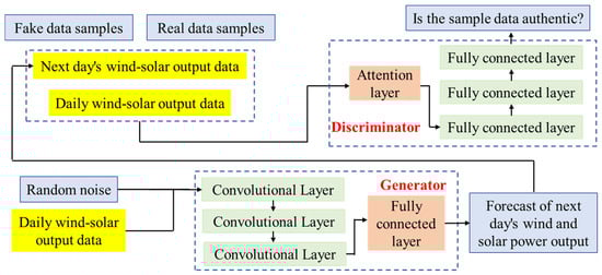 Introducing an attention model into the discriminator can effectively enhance the feature extraction capability of the discriminator, enabling it to efficiently guide the generator in producing data. In this paper, a convolutional neural network is used to construct the generator model. The CGAN network designed in this paper generates forecasted wind and solar power output for the next day based on actual measured data for the current day. A schematic diagram of the CGAN network structure is shown in Figure 1.