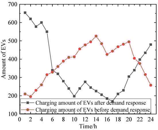 A comparison of the number of EVs on the grid during unordered charging (Scenario 1) and the EVs participating in demand response charging based on electricity prices (Scenario 2) is shown in Figure 3.