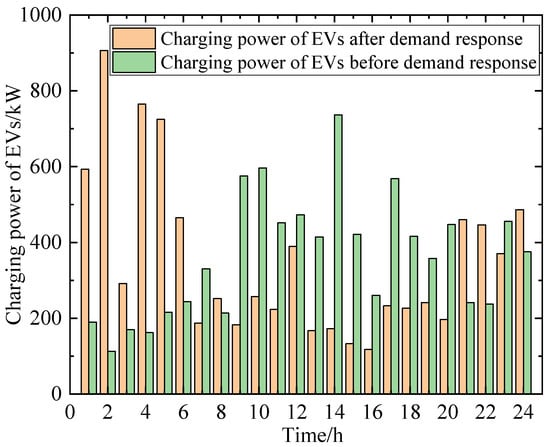 The comparison between the EV load during unordered charging (Scenario 1) and the EV load when participating in demand response based on electricity prices (Scenario 2) is shown in Figure 4.