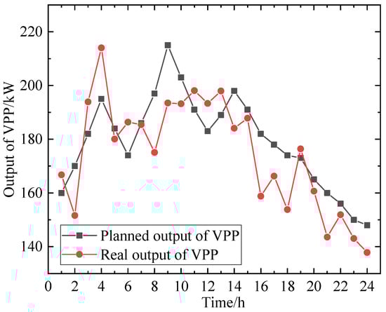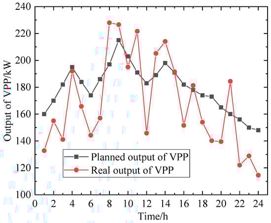 Observing the above figure, we can find that in Scenario 2, during peak hours, the number of EVs charging decreases, resulting in a reduction of 14.56 MW in EV charging load compared to unordered charging; during flat hours, the EV charging load decreases by 9.40 MW compared to unordered charging, and the economic benefit of the VPP increases by USD 867.54 after demand response; during off-peak hours, the number of EVs charging increases, leading to an increase of 31.51 MW in EV charging load compared to unordered charging. Therefore, EV participation in demand response can reduce EV charging load during peak hours and shift it to off-peak hours. Active participation of EV users in demand response can change the EV charging time and charging power, which not only increases the economic benefit of the VPP but also reduces the “peak on peak” phenomenon caused by a large number of EVs charging simultaneously. During the operation of the VPP, there is a deviation between the planned output and the actual output, and the VPP needs to pay a corresponding penalty cost to the system. Figure 5 shows a comparison of the planned output and actual output of the VPP when EVs do not participate in its scheduling, with an overall output deviation of 9.26%. Figure 6 shows a comparison of the planned output and actual output of the VPP when EVs participate in its scheduling, with an overall deviation of 5.16%. By comparing these figures, it can be seen that EV participation in VPP scheduling helps to reduce the deviation between planned and actual output, improve the flexibility of internal scheduling within the VPP, and reduce penalty costs for the VPP.