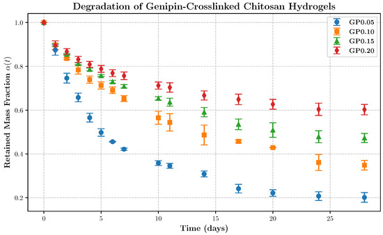 Degradation profiles of genipin-cross-linked chitosan hydrogels at varying genipin concentrations. Error bars indicate the 95% confidence interval, calculated as , where is the sample standard deviation and .