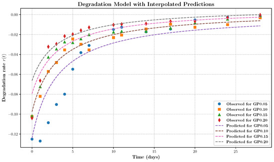 To capture the effect of , we fitted a single model to the combined data from all four experiments. Because remains constant within each experiment, modeling all data jointly is necessary to properly identify its influence on the degradation rate.