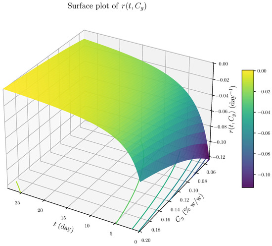 Figure 4 illustrates the predicted degradation rate across the domain of genipin concentration and time t, based on Equation (10).