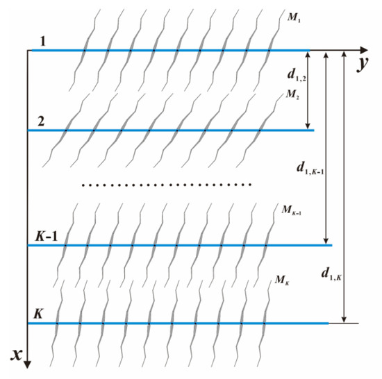 a. A total of K vertically aligned fractured horizontal wells are distributed along the positive x-axis. The spacing between the k-th well (where k = 1, 2, …, K) and the first well is denoted as d1,k;