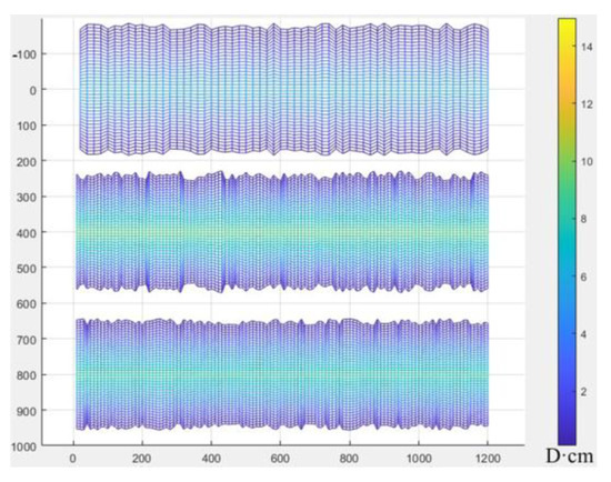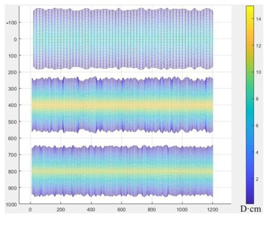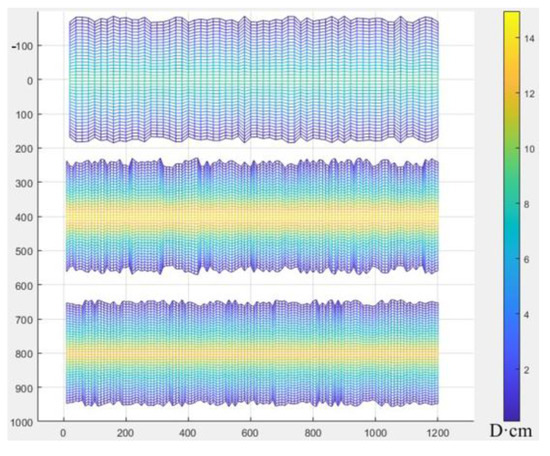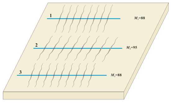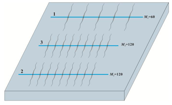 In the marine–terrestrial transitional shale reservoir, Well 1 was the first long-fractured well with large fracture spacing to be put into production; Well 2 was a short-fractured well with small fracture spacing that was put into production one year after Well 1; and Well 3 was a new well (adjustment well) to be put into production between the two old wells. The relative positions of these three wells are shown in Figure 7, and the related parameters are listed in Table 3 and Table 4. In Figure 7, labels 1–3 correspond to horizontal Wells 1 through 3, while M indicates the number of fractures associated with each respective well. The fracture distribution patterns and conductivity profiles for each of the three wells are presented in Figure 8 and Figure 9, Figure 10, Figure 11 and Figure 12, respectively. In Figure 8, the x-axis represents the length of the horizontal well pattern, while the y-axis indicates the fracture length. For Figure 9, Figure 10, Figure 11 and Figure 12, the x-axis similarly denotes the horizontal well pattern length, with the y-axis representing fracture conductivity. The spacing between the three wells is set as follows: d1,3 = d2,3 = 400 m. The previously validated multi-stage fractured well interference model was applied to determine optimal completion parameters for the adjustment well, utilizing petrophysical and geomechanical inputs from Table 3 through an ensemble-based optimization workflow.