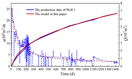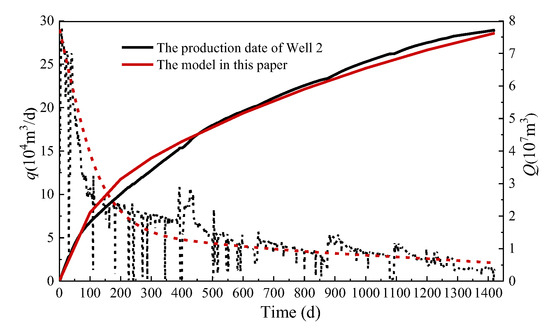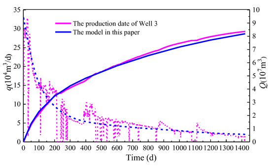The production prediction results of the three wells were compared with the actual production data, as shown in Figure 4, Figure 5 and Figure 6. From these three figures, the production decline curves obtained by the model established in this paper generally have a good match with the real-time production decline trends reflected in the production data. For Well 1, the cumulative gas production after 1421 days of production was 6.73 × 107 m3, while the cumulative gas production simulated by the model in this paper was 6.72 × 107 m3, with a difference of 0.1%. For Well 2, the cumulative gas production after 1421 days of production was 7.72 × 107 m3, while the cumulative gas production simulated by the model in this paper was 7.62 × 107 m3, with a difference of 1.3%. For Well 3, the cumulative gas production after 1421 days of production was 8.37 × 107 m3, while the cumulative gas production simulated by the model in this paper was 8.13 × 107 m3, with a difference of 2.95%. The field verification shows that simulated production curves for all three wells fall within 10–15% of actual measurements, validating the model’s predictive capability. The consistent underprediction trend suggests the need to incorporate fracture network complexity, particularly the near-wellbore diversion effects and induced micro-fractures beyond main planar fractures.
