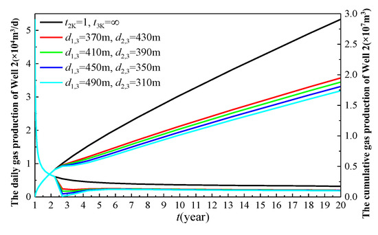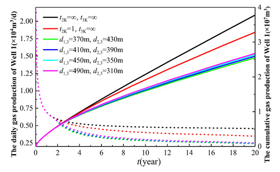 In Figure 13, the black curve represents the production of Well 1 when it is the sole producer (Wells 2 and 3 remain shut-in). The red curve depicts the production behavior of Well 1 after Well 2 is brought online following one year of the production from Well 1. The remaining curves demonstrate the production performance of Well 1 under varying well spacing configurations, where Well 2 is brought online 1 year after Well 1’s initial production, and Well 3 commences production 3 years after Well 1’s startup (i.e., 2 years after Well 2’s activation). As illustrated in Figure 13, the gas production of Well 1 increases as the distance d1,3 between Well 1 and Well 3 grows. This phenomenon can be attributed to the reduced interference from Well 3 on Well 1 as the distance increases, thereby enhancing the productivity of Well 1. In the scenario where only Well 2 is operational without Well 3, the cumulative gas production of Well 1 over a 20-year period is 3.28 × 107 m3. When the well spacing d1,3 is set at 370 m, 410 m, 450 m, and 490 m, the corresponding 20-year cumulative gas production of Well 1 is 2.549 × 107 m3, 2.593 × 107 m3, 2.635 × 107 m3, and 2.674 × 107 m3, respectively. Compared to the scenario with only Well 2 in operation, the cumulative gas production of Well 1 decreases by 22.3%, 20.9%, 19.7%, and 18.5% for the respective spacing. The cumulative gas production increases by 1.73%, 1.59%, and 1.48% as the spacing increases from 370 m to 490 m. The average increase rate per meter (cumulative gas production increase/increased spacing) is 0.043%, 0.04%, and 0.037%, respectively. The trend of increasing and then decreasing rates suggests that an optimal value exists for the well spacing d1,3.