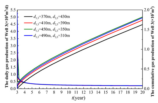 As illustrated in Figure 15, the gas production of Well 3 increases as the well spacing d1,3 becomes larger. Specifically, the closer Well 3 is to Well 2 and the farther it is from Well 1, the higher its gas production. This indicates that the influence of Well 1 on Well 3 is more significant than that of Well 2. Although Well 1 is a long-fractured well with large spacing, it was put into production earlier than Well 2. By the time Well 3 began production, Well 1 had already been producing for 3 years, while Well 2 had only been operational for 2 years. Consequently, the cumulative gas production of Well 1 over 3 years exceeded that of Well 2 over 2 years. Therefore, when Well 3 commenced production, the formation pressure near Well 1 was lower compared to that near Well 2. As a result, the closer Well 3 is to Well 1, the lower the formation pressure, leading to the reduced gas production from Well 3. From the perspective of cumulative gas production, when the well spacing d1,3 is set at 370 m, 410 m, 450 m, and 490 m, the cumulative gas production of Well 3 over 17 years is 1.627 × 107 m3, 1.74 × 107 m3, 1.821 × 107 m3, and 1.799 × 107 m3, respectively. The increase in the cumulative gas production is 6.92%, 4.67%, and −1.2%. The trend of the increasing and then decreasing cumulative gas production suggests that there is an optimal value for the well spacing d1,3.