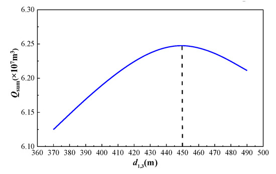 From the previous literature [31], it is known that the optimal opening time for adjustment wells is between 2.85 and 3 years. Therefore, the opening time is set to 3 years. With Wells 1 and 2 positionally constrained (d1,2 = d1,3 + d2,3 = 800 m), a parametric analysis was conducted by systematically varying inter-well distances d12 and d13. This generated production profiles (daily rate q, cumulative Q vs. time t) across spacing scenarios, with results presented in Figure 13, Figure 14 and Figure 15.