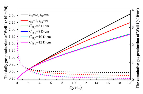 Cumulative gas production of three wells corresponding to different main fracture conductivities.