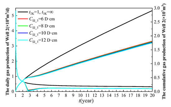In Figure 17, the black curve represents the production of Well 1 when it is the sole producer (Wells 2 and 3 remain shut-in). The red curve depicts the production behavior of Well 1 after Well 2 is brought online following one year of production of Well 1. The remaining curves demonstrate the production performance of Well 1 under varying well spacing configurations, where Well 2 is brought online 1 year after Well 1’s initial production, and Well 3 commences production 3 years after Well 1’s startup (i.e., 2 years after Well 2’s activation). As illustrated in Figure 17 and Figure 18, the greater the main fracture conductivity (Cfd_3) of the infill well, the lower the production of Well 1 and Well 2. This is because a higher main fracture conductivity creates an easier flow of natural gas from the formation into the horizontal wellbore of the infill well, indirectly reducing the natural gas production of the two older wells. Specifically, when Cfd_3 is set to 6D·cm, 8D·cm, 10D·cm, and 12D·cm, the cumulative gas production of Well 1 over 20 years is 2.635 × 107 m3, 2.625 × 107 m3, 2.614 × 107 m3, and 2.604 × 107 m3, respectively, resulting in a total decline of 1.2%. Similarly, the cumulative gas production of Well 2 over 19 years is 1.809 × 107 m3, 1.789 × 107 m3, 1.77 × 107 m3, and 1.751 × 107 m3, respectively, leading to a total decline of 3.3%.