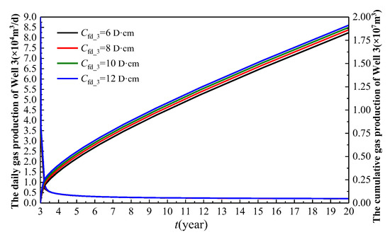 From the preceding analysis, we have determined the spacing for the infill well. Next, we will investigate the impact of the main fracture conductivity (Cfd_3) of the infill well on the performance of the well group. By varying the main fracture conductivity Cfd_3, we can obtain the curve characteristics of the daily production (q), cumulative production (Q), and time (t) for the three wells under different levels of main fracture conductivity. The resulting curves are illustrated in Figure 17, Figure 18 and Figure 19.