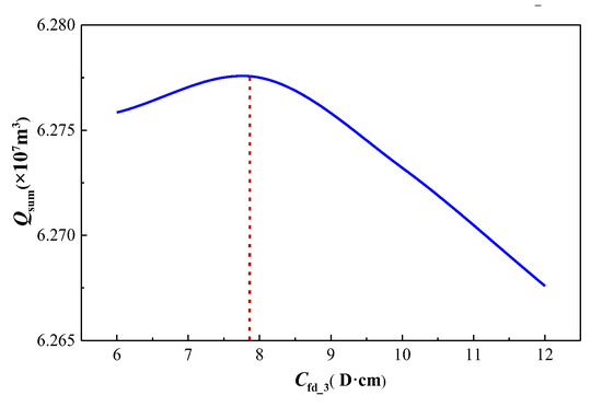 Considering the cumulative gas production of the three wells, it is observed that as the main fracture conductivity (Cfd_3) of the infill well increases, the production of the two older wells decreases, while the production of the infill well increases. Consequently, the total cumulative gas production of the well group initially rises and then declines, indicating the existence of an optimal value for the main fracture conductivity of the adjustment well. By using the cumulative gas production of the three wells as the objective function, the optimal main fracture conductivity Cfd_3 can be determined. The cumulative gas production of the three wells under different values of Cfd_3 is summarized in Table 6. The curve representing the total cumulative gas production of the three wells as a function of the main fracture conductivity Cfd_3 is depicted in Figure 20. As shown in Figure 20, the curve reaches its peak when the main fracture conductivity Cfd_3 is 7.8D·cm. Therefore, the optimal main fracture conductivity for the adjustment well is 7.8D·cm.