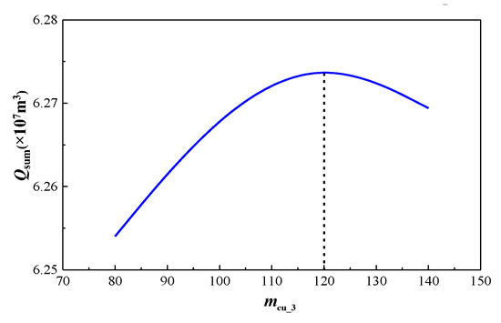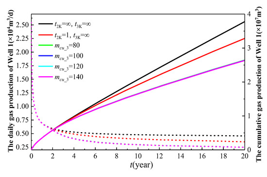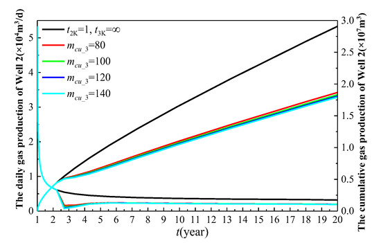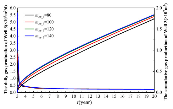 As illustrated in Figure 22, as the number of main fractures (mcu_3) of the infill well increases, the production of Well 2 gradually decreases. This is because a higher number of main fractures leads to greater inter-well interference between Well 3 and Well 2, thereby reducing the production of Well 2. Without Well 3, the cumulative gas production of Well 2 over 19 years is 2.91 × 107 m3. When mcu_3 is set to 80, 100, 120, and 140, the cumulative gas production of Well 2 over 19 years is 1.867 × 107 m3, 1.832 × 107 m3, 1.809 × 107 m3, and 1.794 × 107 m3, respectively. Compared to the scenario without Well 3, the cumulative gas production of Well 2 decreases by 35.8%, 37%, 37.8%, and 38.4%, respectively. As mcu_3 increases from 80 to 140, the reduction in the cumulative gas production of Well 2 is 1.875%, 1.255%, and 0.829%, respectively. The decreasing trend in the reduction rate suggests that there is an optimal value for the number of main fracture clusters (mcu_3) of the infill well.