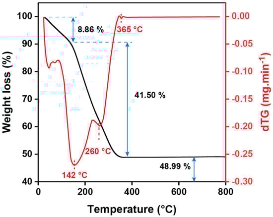 The calcination temperature was determined through thermogravimetric analysis (Figure 1), which indicated a weight loss event below 100 °C (which can be attributed to loss of free water and/or solvent removal) and other two weight loss events at 142 and 260 °C, which can be associated with the loss of adsorbed water and light organic compounds, respectively. After heating, a total weight loss of ~50% was observed, without additional weight loss events above 400 °C, which might be associated with the decomposition of organic matter present in the synthesis. Thus, the calcination temperature of 450 °C, with a heating rate of 5 °C min−1, was specified to prevent morphological destruction, as also described in the literature [38,55].