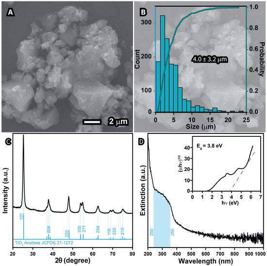 SEM micrograph (A), particle size distribution (B), XRD diffractogram (C), and UV–Vis spectrum (D) of the TiO2 material synthesized at the standard condition [38].