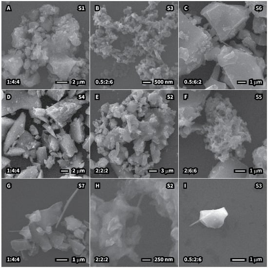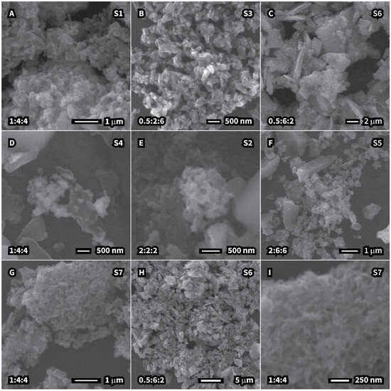 SEM micrographs of the TiO2 materials obtained at the scale of 15 mL to sample S1 (A), S3 (B), S6 (C,H), S4 (D), S2 (E), S5 (F), and S7 (G,I).