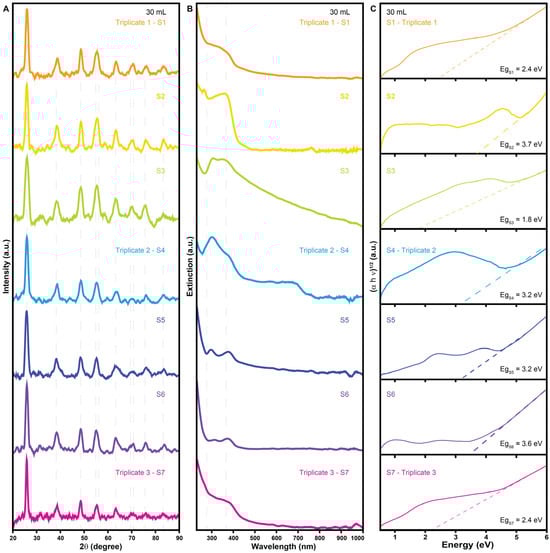 Figure 7 presents the XRD diffractograms and UV–Vis spectra of the obtained TiO2 structures at the scale of 15 mL. Figure 7A shows peaks that correspond exclusively to the anatase phase, indicating that TiO2 synthesis resulted in a crystalline monophasic material. The absence of peaks related to other components suggests the effective purification and removal of synthesis-related impurities. Figure 7B shows extinction peaks in the UV region (~250 to ~400 nm), as expected for TiO2 with a band gap of 3.2 eV. Notably, some samples, such as S2 and S3, displayed two distinct extinction peaks: the primary peak in the UV region is attributed to the intrinsic band gap absorption of anatase TiO2, while the secondary peak suggests the presence of different electronic states within the band gap [63,64,65].