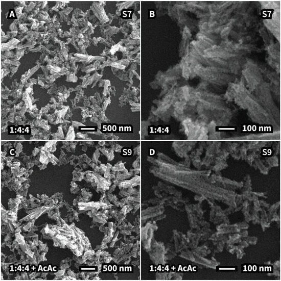 Afterward, 30 mL of isopropanol or 30 mL of acetic acid was also used to dilute the central point experiment. The SEM micrographs in Figure 8 display results for acetic acid (Figure 8B) and isopropanol (Figure 8C) dilutions. Sample S9, diluted with acetic acid, underwent gelation 15 min after isopropanol was added to the acetic solution (no further acetic acid was added). The TiO2 structures exhibited rod morphology with a width of 109.6 ± 27.7 nm and length of 462.5 nm in a hierarchical structure formed by smaller nanorods of 25.3 nm in width. Figure 6C,D depicts a high-magnification micrograph of sample S9 that depicts a rod morphology, which suggests effective nucleation, with the acidic medium catalyzing the reaction, nucleation, and growth. Sample S9 yielded smaller particles with elongated morphologies, as also shown in Figure 3B and Figure 5B. This can be attributed to (i) acetic acid acting as a catalyst in the sol–gel reaction and (ii) its role as a capping agent [67].