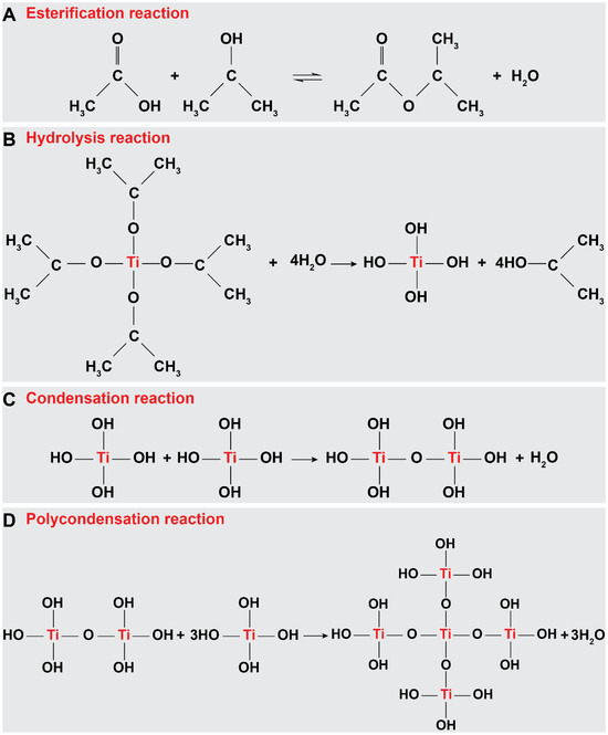 Schematic representation of the reaction steps during the synthesis of TiO2 nanostructures via the sol-gel method, including esterification (A), hydrolysis (B), condensation (C), and polycondensation (D).