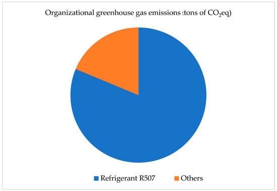 From the proportion of greenhouse gas emissions in Scope 1, the findings indicate that R507 refrigerant use in the production cooling system is the highest contributor to greenhouse gas (GHG) emissions, accounting for 9907 tons of CO2eq equivalent or 78.10% of Scope 1 emissions (Figure 3).