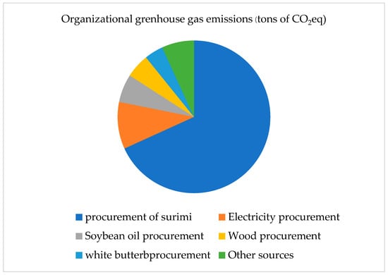 From the proportion of greenhouse gas emissions in Scope 3, the findings indicate that the most significant contributor is the procurement of surimi (processed fish meat), which generates 20,844 tons of CO2eq, representing 66.04% of total Scope 3 emissions. Other notable contributors include electricity procurement at 3042 tons of CO2eq (9.63%), soybean oil procurement at 1824 tons of CO2eq (5.78%), wood procurement at 1555 tons of CO2eq (4.92%), white butter procurement at 1217 tons of CO2eq (3.85%), and other sources at 2082 tons of CO2eq (6.60%) (Figure 5).