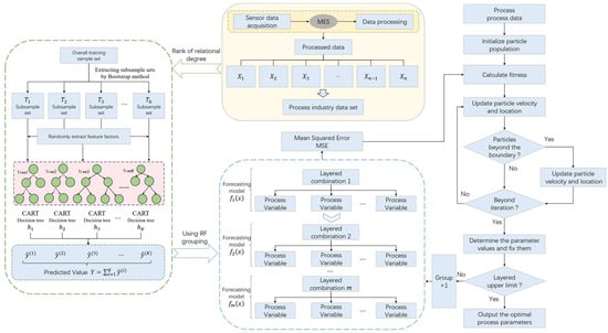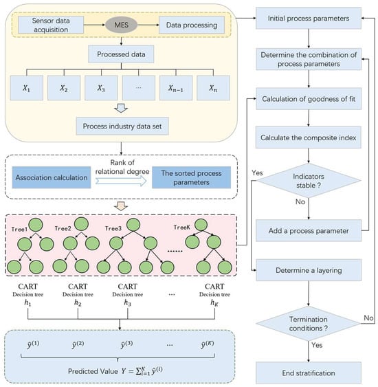 25]. In order to effectively reduce the complexity of the model and improve the computational efficiency, a hierarchical model of process parameters based on importance evaluation is constructed. Firstly, the correlation degree between each process parameter and quality index is calculated by correlation degree analysis, and the process parameters are sorted according to the degree of correlation. Subsequently, the random forest regression model was used to hierarchically process the sorted process parameters. Among them, the process parameter stratification method is shown in