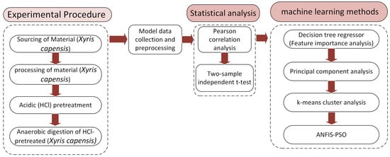 The efficiency of biogas production is significantly influenced by feedstock composition, process parameters, and microbial dynamics, rendering optimization challenging. Consequently, intelligent models have demonstrated efficacy in intelligent feedstock management and real-time decision-making. Interest in advanced computational techniques for extensive data-driven insights into biogas research technology has grown recently. Different mathematical models, including modified Gompertz, logistic, and first-order statistical methods, have been investigated to predict AD yield [13]. However, a paradigm shift from these classical models to artificial intelligence (AI) and machine learning (ML)-based models has been noted to analyze the complex non-linear relation in the AD process. An Artificial Neural Network (ANN) was used to predict and monitor the biogas released from cassava wastewater, and the retention time, pH, and calcium eggshell concentration were selected as input parameters. It was observed that the model can predict the yield accurately with a correlation coefficient (R2) of 0.9999 [14]. An Adaptive Neuro-fuzzy Inference System (ANFIS) was utilized to predict and optimize the biomethane yield from the anaerobic co-digestion of Xyris capensis and duck waste, with the mixing ratio, temperature, and retention time as input parameters and biomethane as the output parameter. The observed cumulative biomethane and ANFIS predicted yield were 478.42 and 436.20 mL CH4/gVSadded, with a root square mean error of 2.7629 [15]. The biogas released from the Mushroom was modeled using the ANFIS model with the temperature, C/N ratio, and retention time; an R2 value of 0.9997, representing 99% accuracy, was reported [16]. The anaerobic co-digestion of tea waste and cow manure process was modeled using ANFIS, and the model was reported to have around 99% accuracy [17]. However, studies on optimizing and predicting the biomethane yield when the process parameter of pretreatment is considered an input parameter are limited.