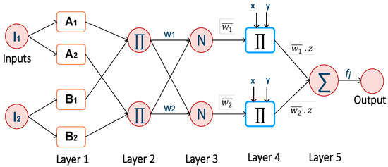 At the normalization layer, fuzzy logic is applied. As seen in Equation (16), the output function is a fraction of the node’s firing strength to the sum of the firing strength of the other nodes.