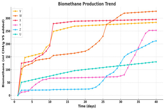 Physicochemical analysis of the sample according to the AOAC standard [18] shows that the sample has 100, 94.00, 44.21, 1.60, 5.68, 48.01, and 27.53 total solids, volatile solids, carbon, nitrogen, hydrogen, oxygen, and C/N ratio, respectively. These results indicate that the sample is a suitable feedstock for biomethane production, considering the composition compared to other lignocellulose feedstocks [21,24]. The acid pretreated and untreated Xyris capensis were digested for a 40 day retention time, and the cumulative biomethane yield is presented in Figure 3. The biomethane yields released were 284.04 ± 10.12, 327.28 ± 13.54, 295.25 ± 11.40, 252.84 ± 10.51, 212.14 ± 10.95, and 130.63 ± 4.35 mL CH4/g VSadded for treatments V, W, X, Y, Z, and U, respectively. The biomethane yield was improved by 117.44, 150.54, 126.02, 93.55, and 62.40% for treatments V, W, X, Y, and Z, respectively, compared to the untreated substrate (treatment U). This result shows that HCl pretreatment enhances the biomethane yield of Xyris capensis. This agreed with previous studies that reported that pretreatment improves the biomethane yield of lignocellulose feedstocks [10,11]. It was noticed from the result that treatment W released the highest biomethane yield of Xyris capensis. This result shows that an increase in the concentration of HCl improves the biomethane yield until a point when the yield starts to decline. It can be observed from the result that lower concentrations of acid with a longer exposure time were more effective than higher concentrations of HCl and a shorter retention time. This could be linked to the strength of the strong acid in producing inhibitory compounds like phenolic acid, 5-hydroxymethylfurfural, and furfural in large quantities that inhibit the biomethane during the digestion process [25]. A similar study reported that a low concentration of HCl released higher reducing sugars from pretreated agave leaf powder. The study shows that 0.5% v/v produces the highest sugar reduction against other higher HCl concentrations [26].