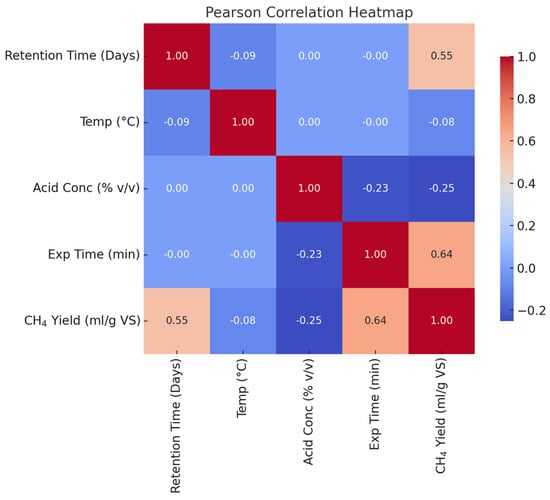 A comprehensive understanding of the interplay between the significant biodigester and pre-treatment conditions and the complex biochemical process within the biodigester provides a valuable insight into methane production trends. A correlation analysis between the critical operating and pre-treatment parameters was performed. These observed correlations underscore the multifactorial nature of the AD process, where no single parameter exclusively dictates the methane yield but rather a collective interaction of physical, chemical, and biological factors. Table 3 presents a statistical summary of the relevant parameters.