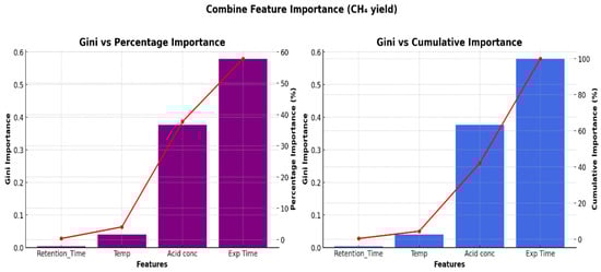 A comprehensive feature importance assessment was conducted to provide further data-driven insights into the AD of Xyris capensis subjected to acidic pretreatment. The Gini important (GI) metric of the DTR was utilized for feature ranking of the critical bio-digestion properties, pretreatment conditions, and their respective influence on predicting the biomethane yield. Figure 5 shows the feature ranking based on the Gini, percentage, and cumulative importance values for each biodigester and pretreatment parameter. With a GI value of 0.5788, exposure time with acid emerges as the dominant driver of output yield and the most significant predictor of biomethane yield, contributing about 60% of the predictive power in predicting the biomethane yield. The acid concentration has a GI value of 0.3771, contributing about 37% to the prediction of methane yield. The other two features (temperature and retention time) collectively contribute less than 5%. This indicates that nearly all significant variability in methane yield can be accounted for by acid contact time and concentration, which are critical for enhancing the CH4 yield, likely affecting the breakdown of lignocellulosic biomass. The very low GI value of the retention time indicates that their variations do not significantly impact the prediction of the CH4 yield. This may indicate that the DTR model does not consider the retention time important or that other features properly represent its impact. Including the retention time into the other features makes no difference in the predictive power. The feature selection for predictive modeling can potentially focus on just the top two features, improving model simplicity and training efficiency with minimal loss in accuracy. This also assists in designing the digestion experiment and optimizing the pretreatment process.