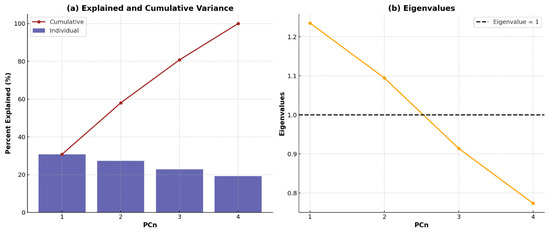 Scree plot showing (a) explained and cumulative variance, (b) eigenvalues relating to each principal component.