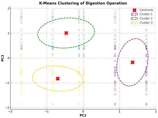 The dynamics of the anaerobic digestion of Xyris capensis subjected to acidic pre-treatment were further illustrated using a k-means cluster analysis visualized through the PCA. The k-means unveils the natural groups and clusters within the operational data of the digestion process by considering all the critical digestion parameters and pretreatment conditions. The cluster analysis revealed three clusters, i.e., three distinct operational frameworks, each aligning with the operational situation of the bio-digestion process (see Figure 7). Cluster 1 most likely encompasses bio-digestion set-ups characterized by reduced retention and contact times with the acid or a higher acid concentration. The PCA projection indicates a diminished influence of PC2 while exhibiting a significant impact of PC1. Cluster 2 illustrates a digestion scenario characterized by balanced operating parameters, likely involving slight exposure duration and acid concentration, as it is centrally positioned. Cluster 3 may indicate prolonged retention and exposure durations or less severe pretreatment conditions. These units constitute a distinct cluster in the lower PCA region.
