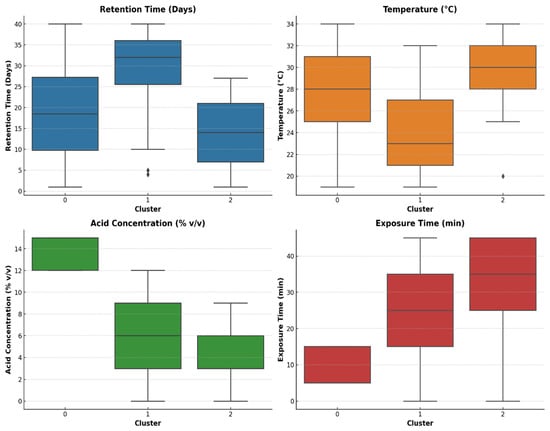 Figure 8 illustrates the distribution and variability of key operating parameters across the three clusters. Acid concentration is the most distinct differentiator among clusters, indicating the impact of pretreatment intensity on clustering. Cluster 0 functions with the highest acid concentration, and is densely concentrated at 13–15% v/v. Cluster 1 exhibits significant acid use, whereas Cluster 2 functions with minimal amounts. The median retention time is maximum at Cluster 1, and closely clustered around 30–35 days. This likely supports stable, high-yield digestion due to extended microbial action. In Cluster 0, the broadest range in retention time was noted, spanning around 1 day up to 40 days and indicating variable retention setups. Cluster 2 exhibits the minimum median retention time, suggesting a focus on shorter digestion cycles. With a median value of 30 °C, cluster 2 operates in the maximum temperature range. This implies that Cluster 2 may exhibit more thermophilic tendencies or better thermal insulation. Clusters 0 and 1 show slightly lower and more variable ranges, with Cluster 1 having the lowest median. Cluster 2 demonstrates the most prolonged acid contact durations, indicating greater acid penetration or hydrolysis. Cluster 2 may enhance gentler acids by protracted contact, reconciling safety with efficacy. Cluster 0 employs the shortest contact, likely owing to the strong acid strength offsetting the duration. Cluster 1 is positioned centrally, exhibiting a wide distribution.