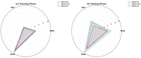 The ANFIS-PSO-GP model has the least area on the radar plot in Figure 10, indicating a lower RMSE, MAE, and MAPE relative to FCM and SC. Wider shapes created by the FCM and SC models suggest larger error metrics. This verifies that GP clustering provides improved learning capacity and error minimization during the building of models. The pattern stays constant, and ANFIS-PSO-GP exceeds the others with lower values on all axes. The radar charts confirm visually that ANFIS-PSO-GP is the most dependable and precise model for forecasting the biomethane yield from Xyris capensis. Its minimal errors and greater resilience throughout training and testing make it the perfect choice for practical bioenergy modeling and deployment. Although all models showed a decline in performance in testing (as expected because of unseen data), GP exhibited superior generalization and slight performance loss. Compared to other machine learning applications in biogas production, the result in this study is higher. Artificial neural network, linear regression, random forest, XGBoost, and support vector machine models were used to optimize and predict the biogas yield from the organic fraction of municipal solid waste. It was observed that regression and XGBoost models produce the best performance with R2 values of 0.68 and 0.88, and RMSE values of 496 and 305, respectively [38], which are lower than what was observed in this study. In a similar study, R2 and RMSE values of 0.72 and 247, respectively, were reported when a Tree-based pipeline optimization tool was used to predict the biogas yield of a municipal wastewater treatment plant [39].