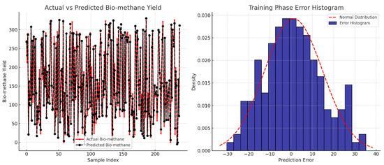 Figure 11 compares the actual and predicted biomethane value at the training stage. This graph shows the actual biomethane yield values compared to the ANFIS-PSO-GP model-predicted values. The actual and predicted values across all sample indices significantly overlap, suggesting great prediction accuracy during training. The model’s capacity to identify nonlinear patterns in the data is confirmed even more by the close clustering of points and consistent tracking of the trends between the real and predicted values. The error histogram shows the distribution of prediction errors during training. The distribution is centered around zero, indicating that the model does not show consistent bias. The bell-shaped error distribution is similar to the overlay normal distribution curve, suggesting that the prediction errors are random. The error distribution verifies that most prediction errors are within a small range and that large departures are uncommon.