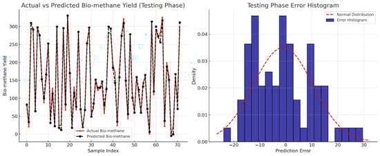 Similarly, at the testing phase, the actual and predicted biomethane value was compared in Figure 12. This chart shows the actual biomethane yield values compared to the ANFIS-PSO-GP model-predicted values at the testing phase. Although certain areas show little variation, the general trend tracking stays consistent. The model accurately predicts biomethane yield during testing outside training data by effectively understanding the complicated, nonlinear relationships required. The histogram shows the spread of prediction errors throughout testing. Centered around zero, the error distribution indicates low bias in model predictions. The error distribution is somewhat more spread out than during training, and the fit with the normal distribution is less perfect, suggesting a broader error spread. Although more diverse than in training, the testing errors still fall within a reasonable range.