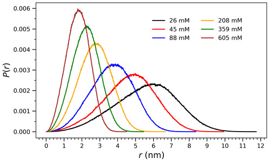 Normalized distributions of radial distances () from the center of mass for arginine molecules at different concentrations. The data reflect the spatial organization and compaction behavior of the system as a function of crowding. At higher concentrations, the distributions become narrower and shift to lower r values, indicating increased molecular packing and a transition toward more compact aggregate structures.
