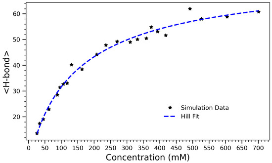 To capture the overall effect of concentration on hydrogen bonding, the average number of hydrogen bonds formed in each system over the course of the simulation was computed. Figure 4 presents the number of hydrogen bonds formed in arginine solutions as a function of concentration. The data exhibit a characteristic sigmoidal trend, reflecting a transition from a sparsely interactive regime at low concentrations to a saturated, highly bonded state at higher concentrations. The system’s behavior is well-described by the Hill equation [45],