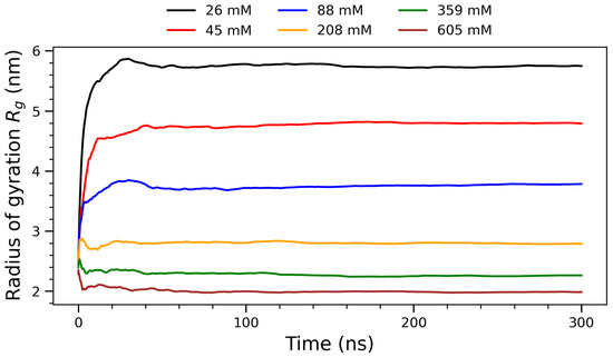 To assess the global structural compaction of the system, the time evolution of the radius of gyration () was examined for each concentration. Figure 5 presents the running averages of the radius of gyration () for arginine molecules over 300 nanoseconds at six different concentrations, ranging from 26 mM to 605 mM. The radius of gyration quantifies the spatial distribution of molecular components around the system’s center of mass and is defined by the following mass-weighted formula: