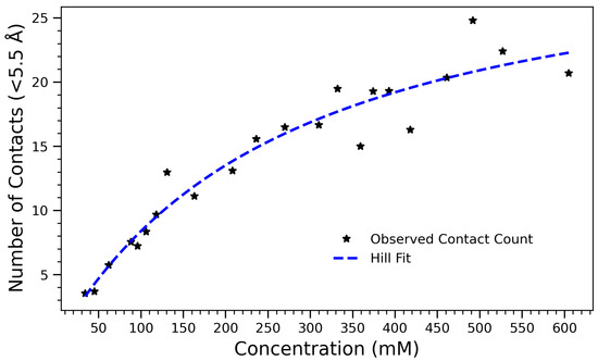 Number of contacts formed within 5.5 Å as a function of arginine concentration, fitted with the Hill equation . The fit captures the saturating trend in contact formation due to crowding effects and intermolecular interactions. Best-fit parameters are (maximum number of contacts), (half-maximal concentration), and (Hill coefficient), indicating a nearly non-cooperative aggregation process.