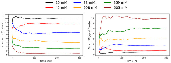 To analyze the spatial aggregation behavior of arginine molecules, a frame-by-frame clustering analysis was performed on multi-model PDB trajectory files using a Python script based on the MDAnalysis (version 2.8.0) library [49]. Each trajectory consisted of a sequence of atomic coordinates representing time-resolved snapshots of the molecular system. In this analysis, only the alpha carbon (C) atoms of each arginine residue were selected as representative coordinates. For each frame, pairwise Euclidean distances between all selected atoms were calculated using scipy.spatial.distance.pdist (version 1.15.2) [50]. A binary adjacency matrix was constructed by applying a distance cutoff of 5.5 Å: any pair of residues separated by less than this threshold were considered directly connected. For each frame, two metrics were computed and recorded: (i) the total number of clusters, and (ii) the size of the largest cluster (i.e., the number of residues it contains). Figure 8 illustrates the temporal evolution of arginine clustering behavior across a range of concentrations, from 26 mM to 605 mM. The left panel shows the total number of clusters identified per frame, while the right panel depicts the size of the largest cluster (in number of residues) over time. At low concentrations (e.g., 26 mM; black curve), the system maintains a high and relatively stable number of small clusters throughout the simulation, indicative of limited molecular association. As the concentration increases, a notable decrease in the number of distinct clusters is observed. This trend reflects enhanced intermolecular encounters and aggregation propensity under crowding conditions, where arginine molecules more frequently come into spatial proximity and form stable aggregates. In contrast, the right panel reveals that the size of the largest cluster increases substantially with concentration. At 26–88 mM, the largest cluster remains small (typically fewer than five monomers), suggesting transient dimer or trimer formation. However, at 359 mM and 605 mM (green and brown curves, respectively), the largest clusters grow rapidly and stabilize at sizes exceeding 10 residues. This behavior indicates the formation of stable supramolecular assemblies sustained throughout the simulation window. Together, the two panels demonstrate a clear inverse relationship between the number of clusters and the size of the largest cluster as a function of concentration. This pattern is consistent with a percolation-like transition [51,52], where increased molecular density leads to cluster coalescence and the emergence of long-lived, cooperative aggregates.
