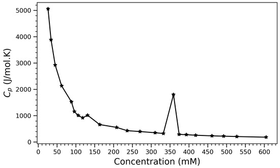 Isobaric heat capacity () of arginine solutions as a function of concentration.